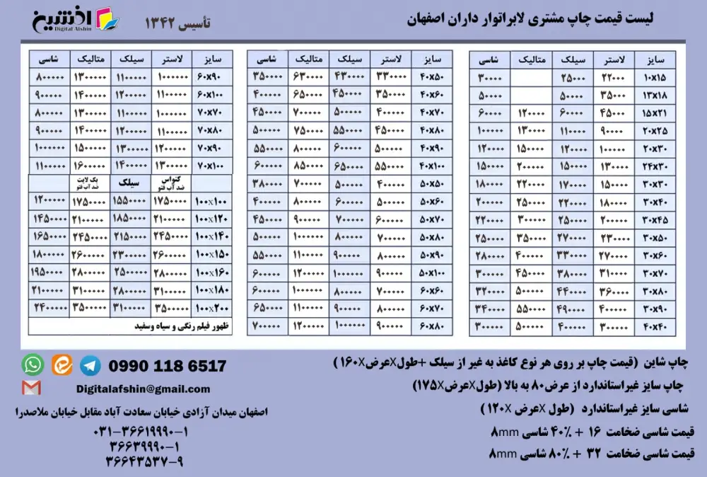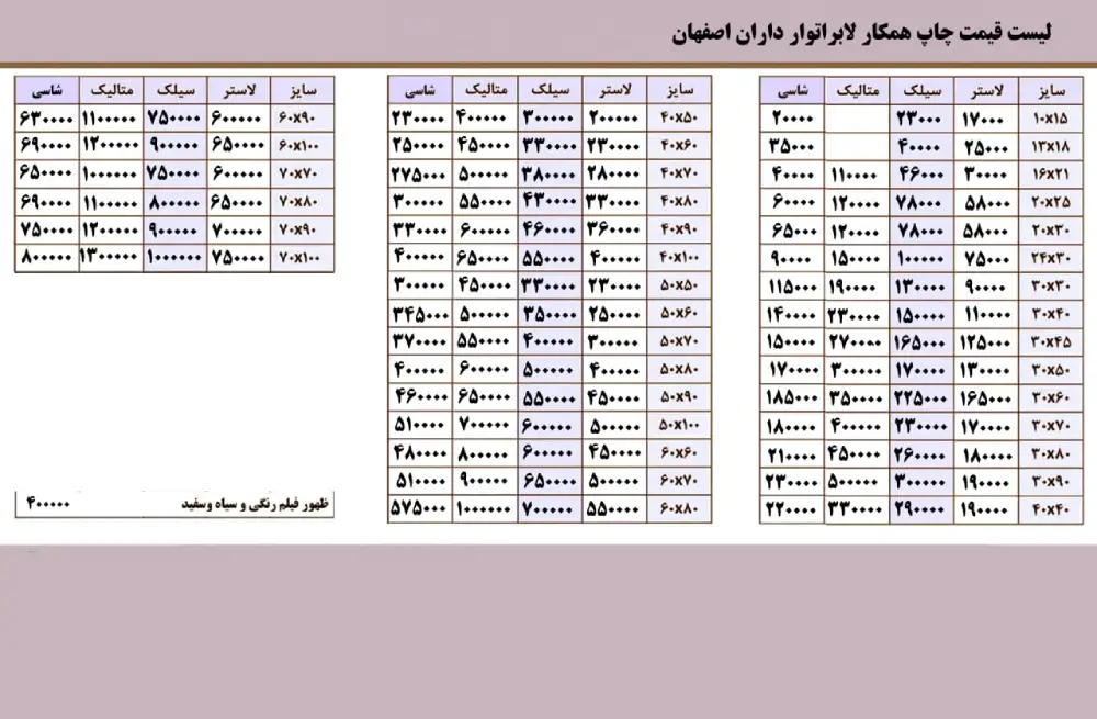 | سایز | لاستر | سیلک | متالیک | شاسی |
